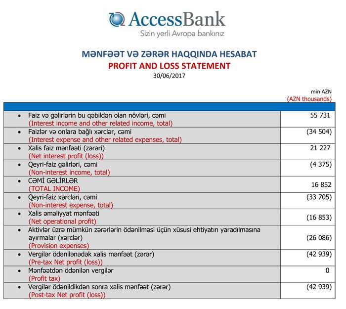 Faiz, qeyri-faiz xərcləri çıxıldığından və aktivlər üzrə mümkün zərərlərin ödənilməsi üçün xüsusi ehtiyatın yaradılmasına 26 milyon 86 min manat ayırıldığından bankın 42 milyon 939 min manat zərəri yaranıb. Qeyd edək ki, zərərin yaranması ehtiyatlara ayırmalar ilə bağlıdır. Ödənməyən kreditlərin arta biləcəyi ehtimalına görə, bank öncədən gəlirinin bir hissəsi hesabına ehtiyatlanır. Yəni, kreditlər qaytarılmadığı halda, "AccessBank", onun kreditorları və əmanətçiləri bundan ziyan çəkməyəcəkdir.