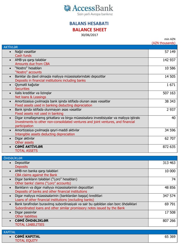 30 İyun 2017-ci il tarixində “AccessBank” QSC 872 milyon 635 min manat cəmi aktivlərə, 807 milyon 266 min manat cəmi öhdəliklərə və 65 milyon 369 min manat cəmi balans kapitalına malik olub. Bank ötən ilin sonunda 1 milyard 58 milyon 871.7 min manat cəmi aktivlərə, 1 milyard 6 milyon 411 min manat cəmi öhdəliklərə və 52 milyon 460 min manat cəmi kapitala malik idi. Kapitalın artması nizamnamə kapitalının artırılması ilə bağlıdır.