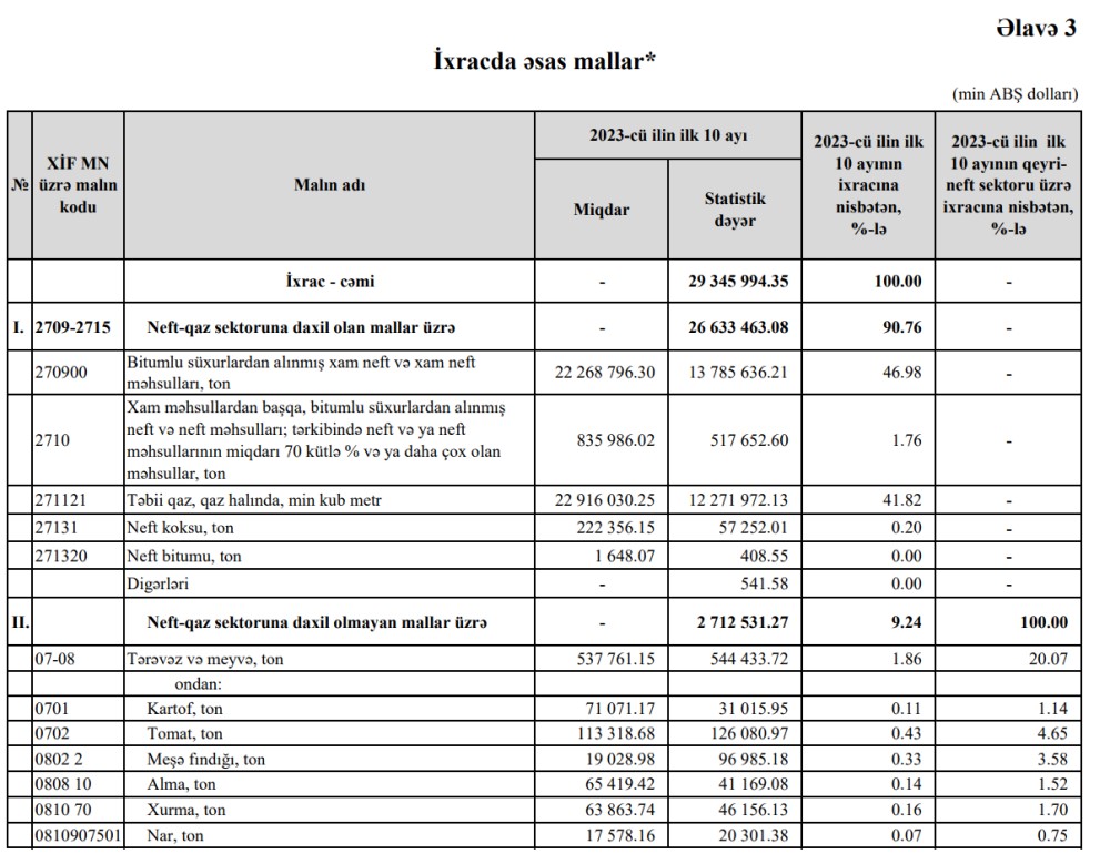 2023-cü ilin yanvar-oktyabr aylarında Azərbaycanın ən çox ixrac və idxal etdiyi mallar.