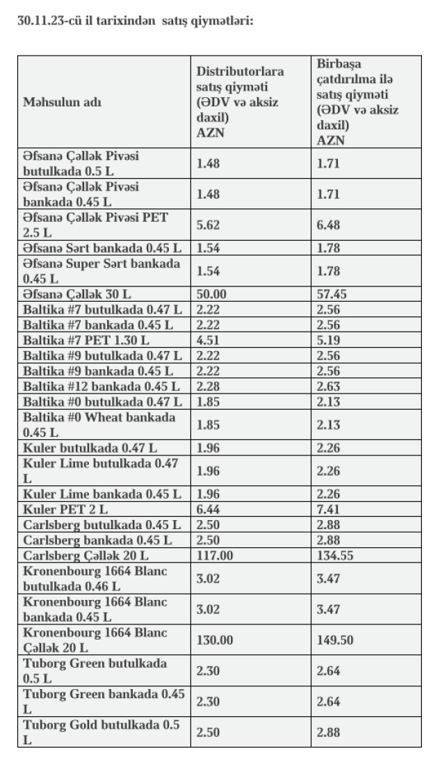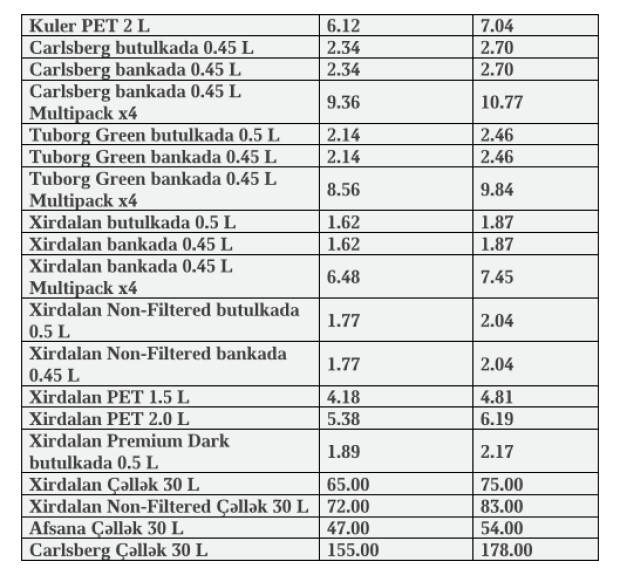 Məsələn, Əfsanə Çəllək Pivəsi butulkada 0.5 L məhsulunun distributorlara satış qiyməti 9 qəpik artırılaraq 1,48 manata, Baltika 7 butulkada 0.47 L məhsulunun qiyməti 8 qəpik artırılaraq 2,22 manata, Kuler Lime butulkada 0.47 L məhsulunun qiyməti 8 qəpik artırılaraq 1.96 manata, Carlsberg butulkada 0.45 L məhsulunun qiyməti 16 qəpik artırılaraq 2.50 manata, Tuborg Green butulkada 0.5 L məhsulunun qiyməti 16 qəpik artırılaraq 2.30 manata, Xirdalan butulkada 0.5 L məhsulunun qiyməti 8 qəpik artırılaraq 1.70 manata, Xırdalan PET 2.0 L məhsulunun qiyməti 16 qəpik artırılaraq 5.54 manata çatdırılıb.