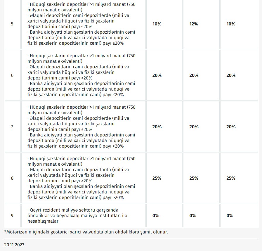 İdarə Heyətinin 1 noyabr 2023-cü il tarixli 53/1 nömrəli qərarı ilə yeni diferensiallaşdırma meyarlarına uyğun olaraq məcburi ehtiyat normaları Cədvəl 1-də olduğu kimi müəyyən edilmişdir.