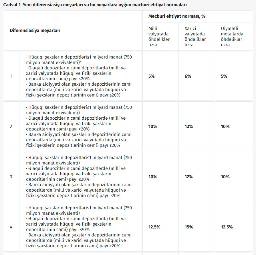 Qeyd edilib ki, aparılmış təhlil və simulyasiyaların nəticələri nəzərə alınmaqla məcburi ehtiyat normaları milli valyutada hüquqi şəxslərin depozitlərinin ümumi məbləğinin bir milyard manatı, xarici valyutada hüquqi şəxslərin depozitlərinin isə ümumi məbləğinin yeddi yüz əlli milyon manat ekvivalentini üstələməsindən əlavə əlaqəli depozitlərin və banka aidiyyəti olan şəxslərin depozitlərinin cəmi depozitlərdə payından asılı olaraq diferensiallaşdırılmışdır.