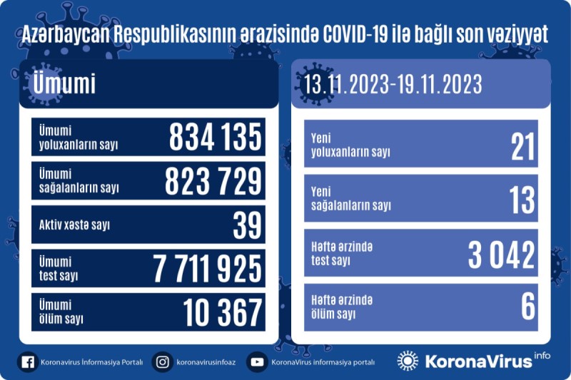 Azərbaycanda koronavirus (COVID-19) infeksiyasına son 1 həftədə (13.11.2023-19.11.2023) 21 yeni yoluxma faktı qeydə alınıb, 13 nəfər müalicə olunaraq sağalıb.