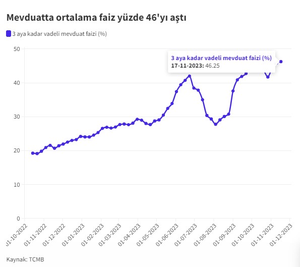 Əmanətlərin əksəriyyətini təşkil edən 1-3 ay müddətində əmanətlər üzrə orta faiz dərəcəsi 46 faizi keçərək son 20 ilin ən yüksək səviyyəsinə çatıb.Türkiyədə depozit faizlərində artım tempi davam edir.