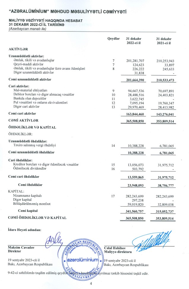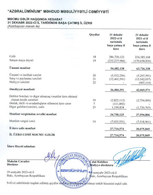 “Azərbaycan Sənaye Korporasiyası” ASC-nin tərkibində fəaliyyət göstərən "Azəralüminium" MMC 2022-ci ili 27 milyon 715 min manat xalis mənfəət ilə başa vurub. Şirkət 2021-ci ili 30 milyon 76 min manat xalis mənfəət ilə bağlamışdı. Beləliklə, 2022-ci ildə 2021-ci illə müqayisədə "Azəralüminium" şirkətinin xalis mənfəti 2 milyon 361 min manat və ya 7,6% azalıb.