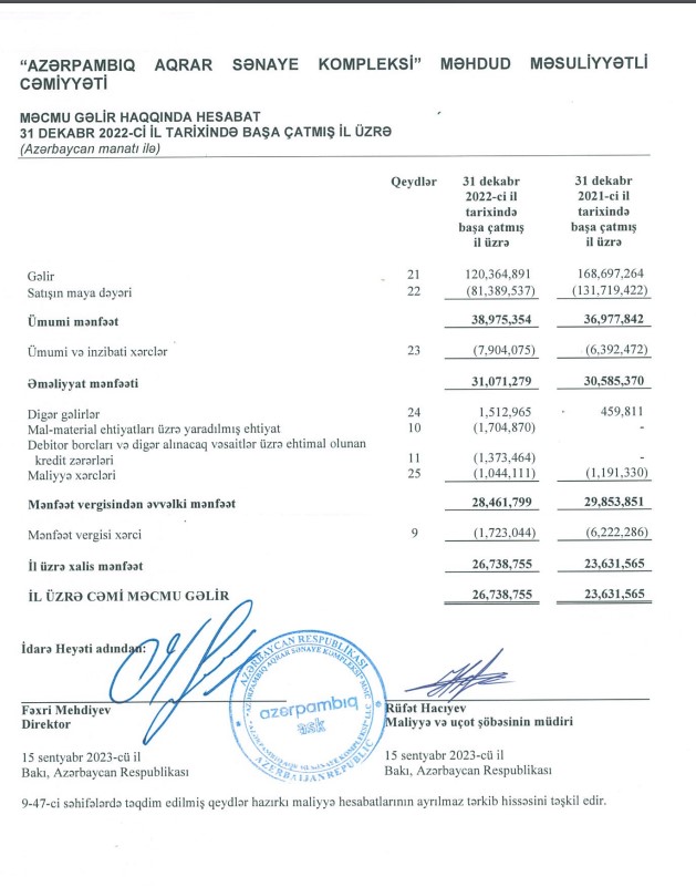 Ötən il “Azərpambıq Aqrar Sənaye Kompleksi”nin satış gəlirinin 48 milyon 332 min manat azalmasına qarşılıq, satışın maya dəyəri 50 milyon 330 min manat azalıb. Həmçinin şirkət ötən il 1 milyon 513 min manat digər gəlirlər əldə edib (2021-də 460 min manat). Xərcin gəlirdən daha çox azalması və digər gəlirlərin artması hesabına “Azərpambıq" şirkətinin xalis mənfəəti yüksəlib.