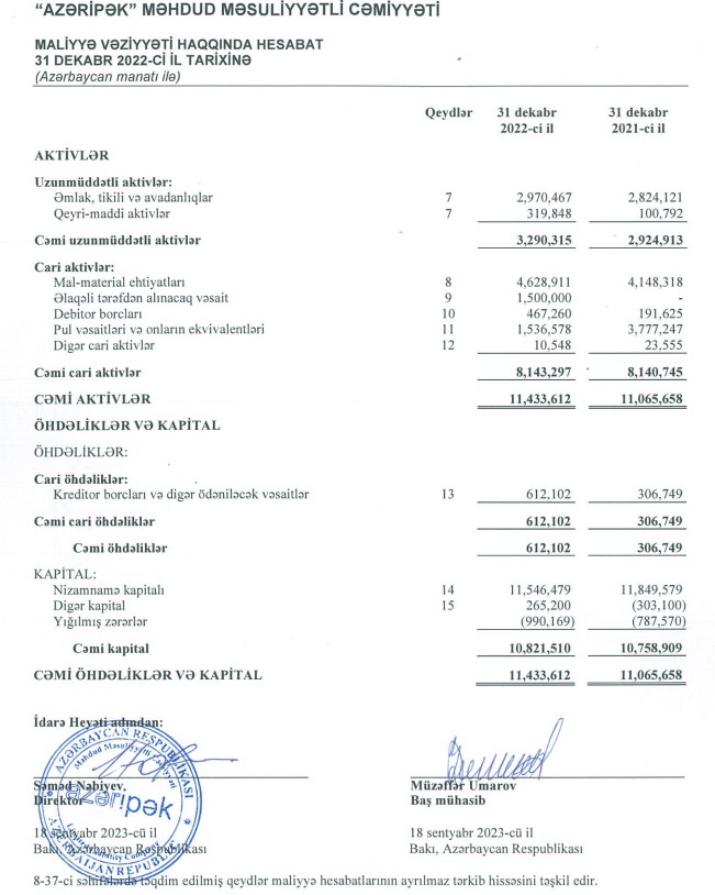 "Azəripək" MMC-nin satışın maya dəyəri və inzibati xərcləri gəlirlərini üstələdiyindən zərər ilə fəaliyyət göstərməkdədir.