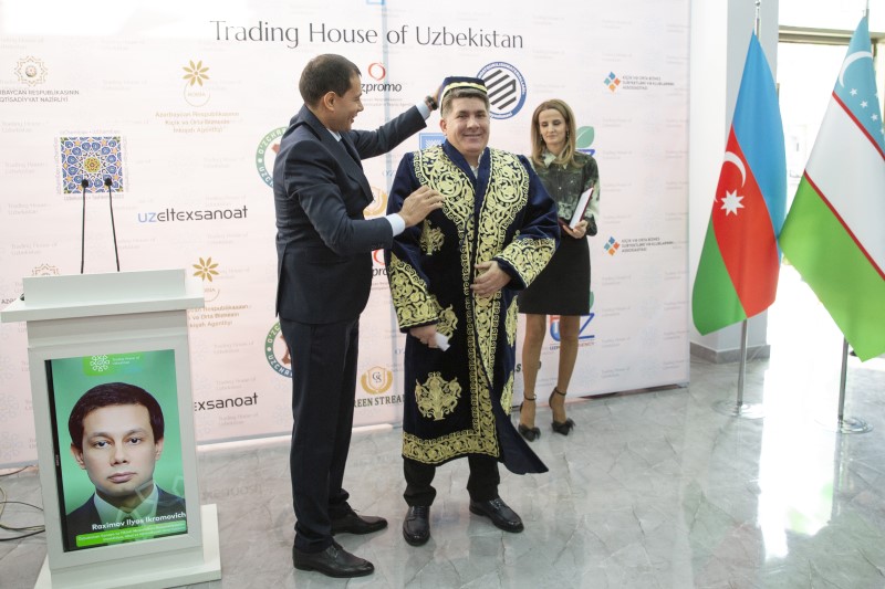 Özbəkistan Sənaye və Tikinti Materialları Assosiasiyasının investisiya, idxal və iqtisadiyyat üzrə müavini Raximov İlyos İkromovich xatirə hədiyyəsini Özbəkistan Ticarət Evinin təsisçi – direktoru Ramin Şərifova təqdim edib. O, isə öz növbəsində belə bir mərkəzin fəaliyyətə başlamasını Özbəkistan və Azərbaycan əlaqələrinin tarixində əlamətdar yer tutacağını bildirib: