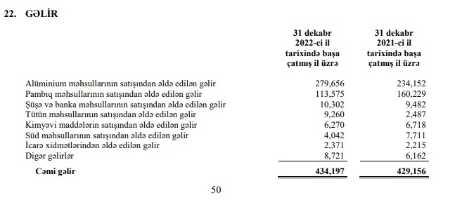 "Azərbaycan Sənaye Korporasiyası” gəlirlərinin böyük hissəsini alüminium məhsullarının və pambıq məhsullarının satışından əldə edir. Belə ki, 2022-ci ildə gəlirlərin 279 milyon 656 min manatı alüminium məhsullarının satışından, 113 milyon 575 min manatı pambıq məhsullarının satışından, 10 milyon 302 min manatı şüşə və banka məhsullarının satışından, 9 milyon 260 min manatı tütün məhsullarının satışından, 6 milyon 270 min manatı kimyəvi maddələrin satışından, 4 milyon 42 min manatı süd məhsullarının satışından və 2 milyon 371 min manat icarə xidmətlərindən əldə edilib.