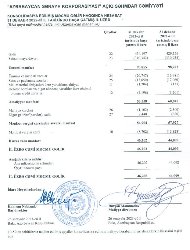 "Azərbaycan Sənaye Korporasiyası” ASC 2022-ci ili 46 milyon 202 min manat xalis mənfəət ilə başa vurub. Şirkət 2021-ci ili 44 milyon 99 min manat xalis mənfəəti ilə bağlamışdı. Xalis mənfəətin 2 milyon 103 min manat artması maliyyə xərclərinin və mənfəət vergisi xərcinin artması ilə bərabər digər gəlirlər əldə etməsilə əlaqədardır.