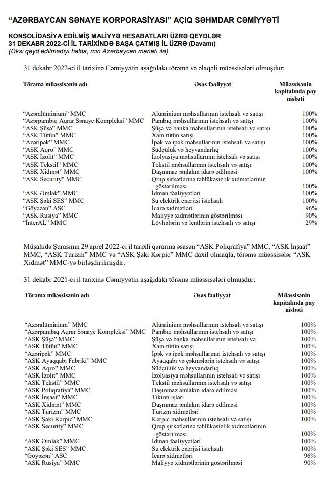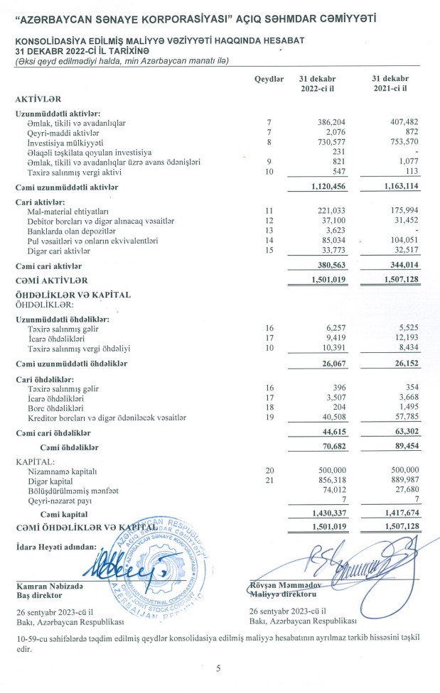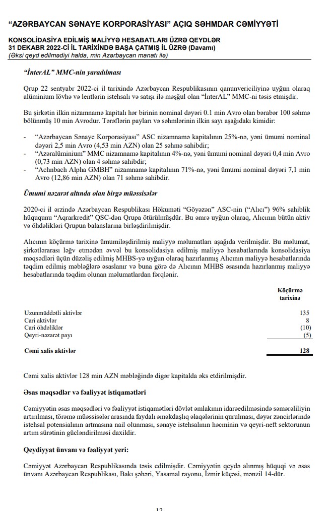 31 Dekabr 2022-ci il tarixində "Azərbaycan Sənaye Korporasiyası" ASC 1 milyard 501 milyon 19 min manat cəmi aktivlərə malik olub. Şirkət 2021-ci ilin sonunda 1 milyard 507 milyon 128 min manat cəmi aktivlərə malik idi. Ötən il cəmi aktivlərin 730 milyon 577 min manatını investisiya mülkiyyəti təşkil edib. 2021-ci ilin sonunda Korporasiyanın törəmə müəssisələrinin sayı 19 ikən, 2022-ci ilin sonunda 15 təşkil edib. Ötən il 1 müəssisə özəlləşdirilib, 4 müəssisə birləşdirilib.