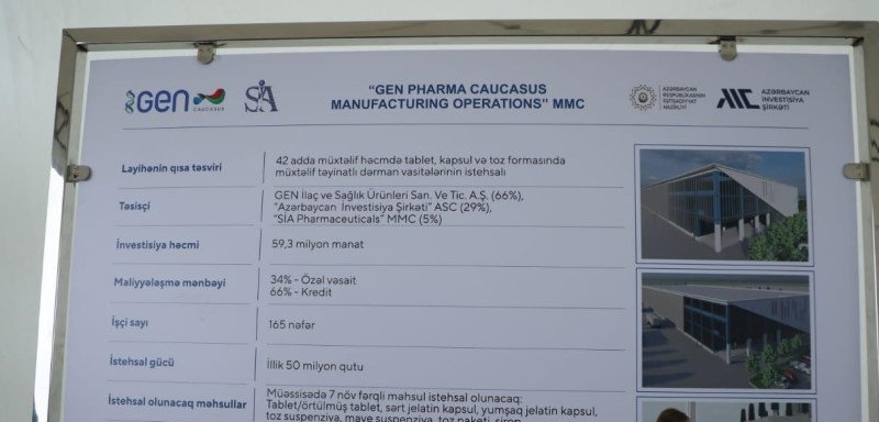 Müəssisədə Türkiyənin qabaqcıl texnologiyalarının tətbiqi ilə 42 adda müxtəlif doza və qablaşdırmada dərman məhsulları istehsal olunacaq. İnşa ediləcək zavodun investisiya dəyəri 59,3 milyon manatdır. Müəssisədə 165 nəfər daimi işlə təmin ediləcək. Zavodun fəaliyyətə başlamasından sonra ölkədə bir sıra əczaçılıq məhsullarına tələbat yerli istehsal hesabına ödəniləcək, idxaldan asılılıq azaldılacaq. İllik istehsal gücü 50 milyon qutu nəzərdə tutulan zavodda istehsal edilən məhsulların daxili bazara satılması ilə yanaşı, “Made in Azerbaijan” brendi ilə region ölkələrinə də ixracı planlaşdırılır.