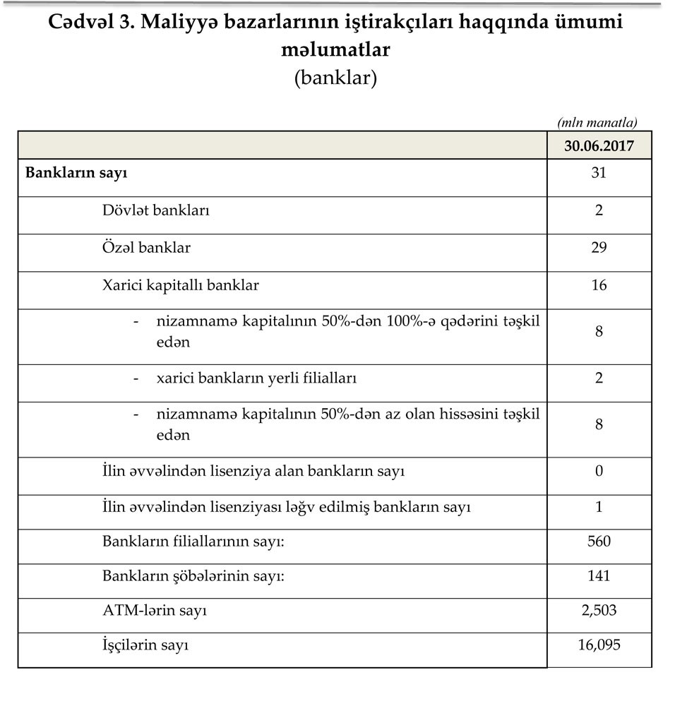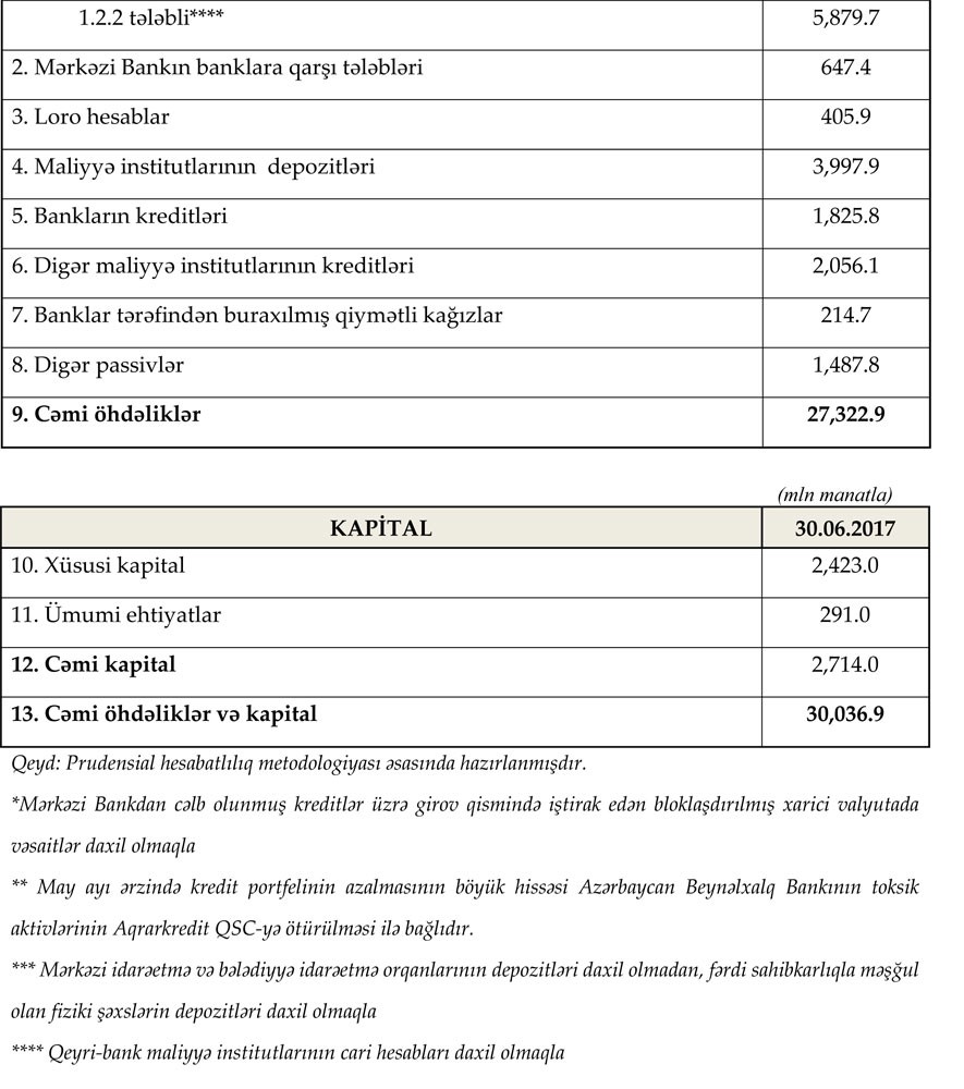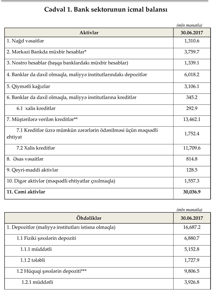 Azərbaycanda fəaliyyət göstərən 31 bankın 30 iyun 2017-ci il tarixinə cəmi aktivləri 30 milyard 36.9 milyon manat, cəmi öhdəlikləri 27 milyard 322.9 milyon manat təşkil etmişdir.