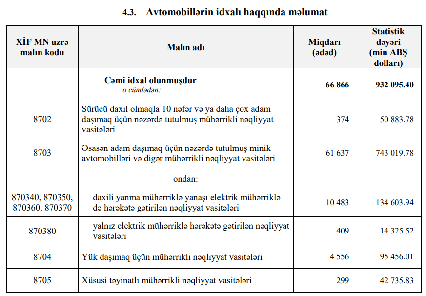 2022-ci ilin yanvar-noyabr aylarında Azərbaycana 932 milyon 95 min dollar dəyərində 66 min 866 ədəd nəqliyyat vasitəsi idxal olunmuşdu.