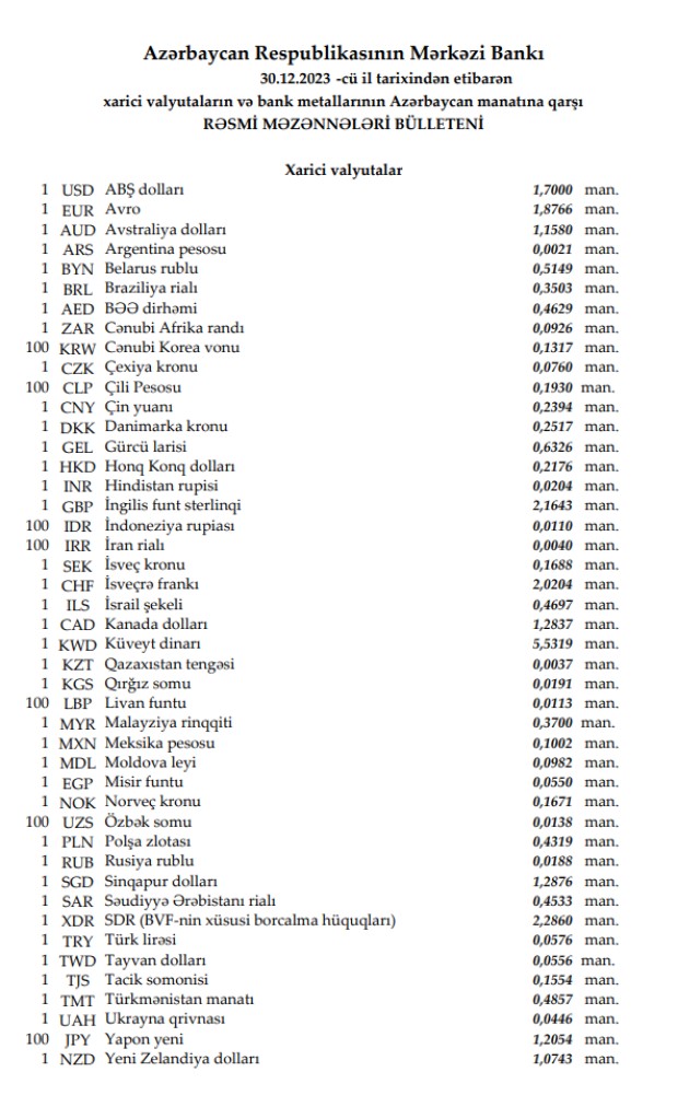 Rəsmi məzənnələr açıqlandı