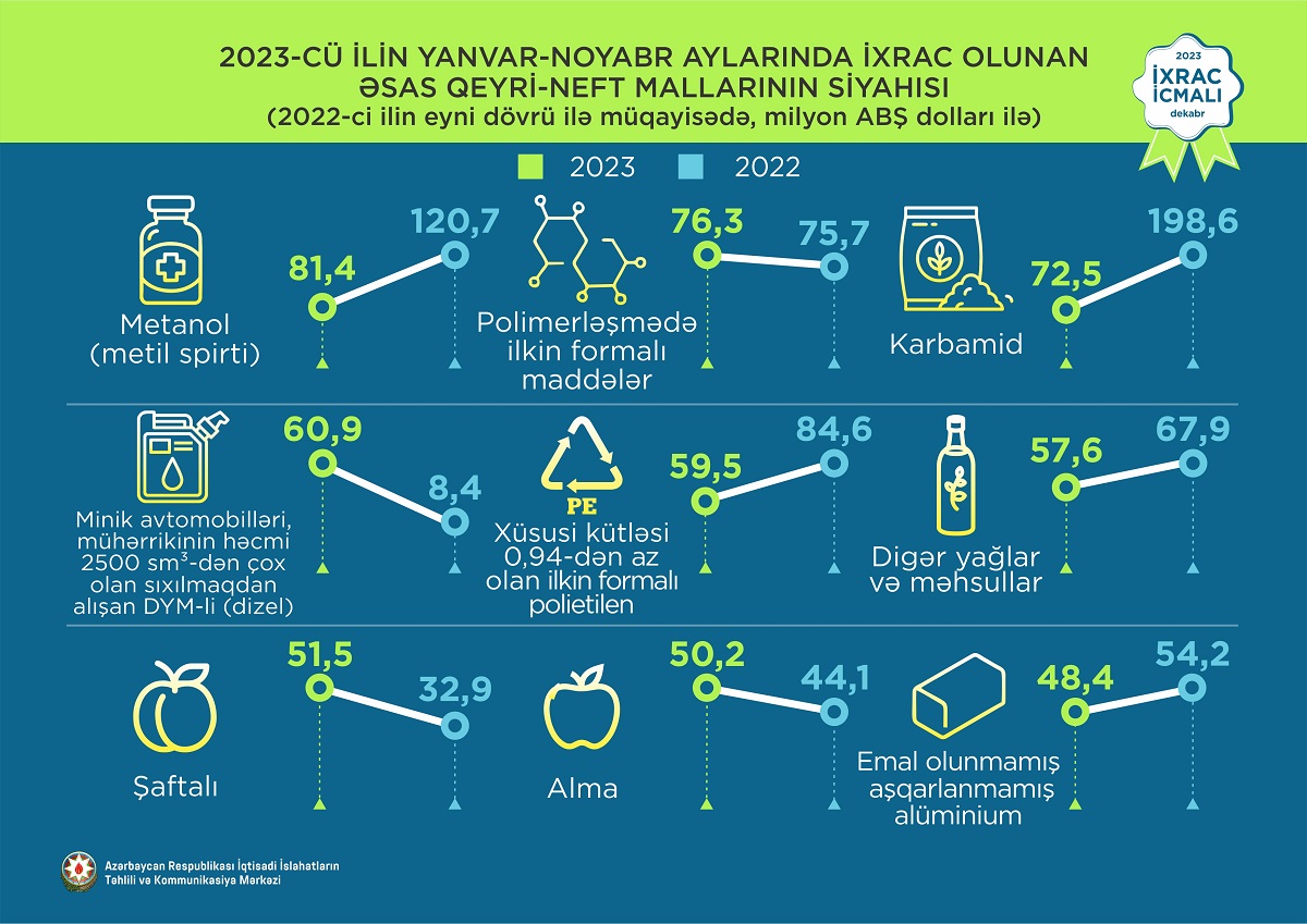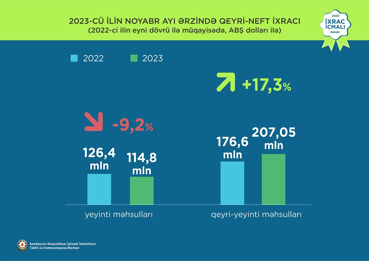 2023-cü ilin noyabr ayında ixrac edilən qeyri-neft sektoruna aid malların siyahısında xurma (45,3 milyon ABŞ dolları) birinci, elektrik enerjisi (31,2 milyon ABŞ dolları) ikinci və qızıl (25 milyon ABŞ dolları) üçüncü olub.