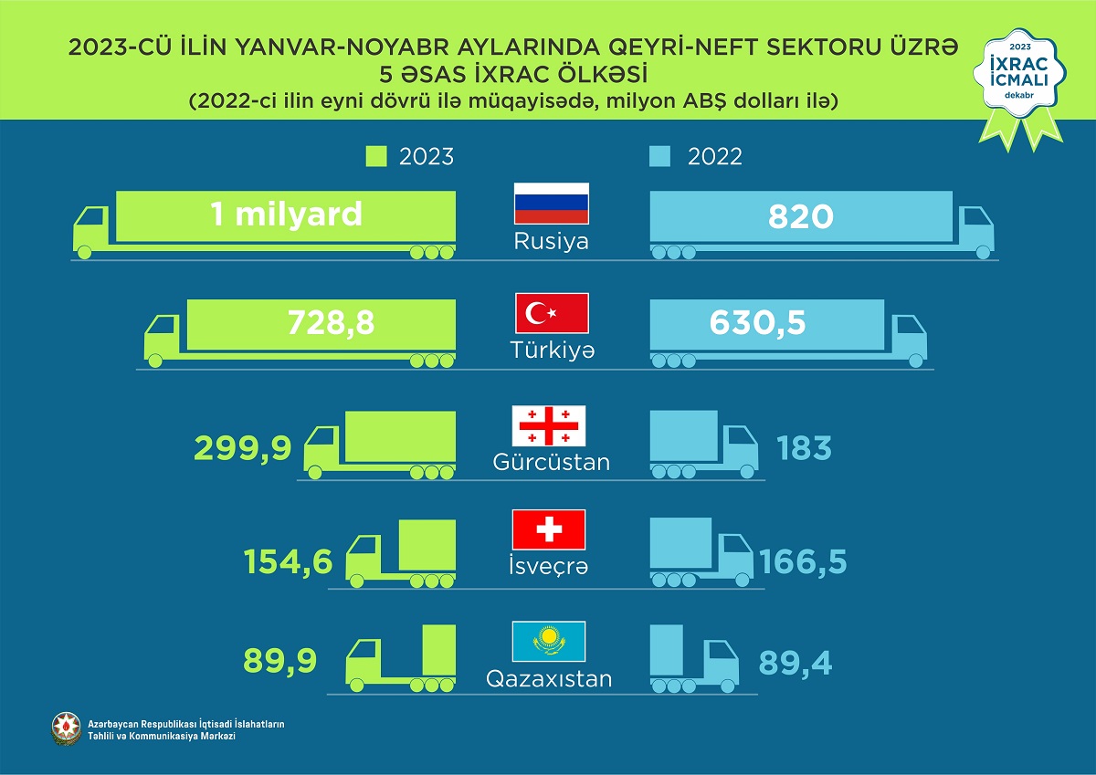 2023-cü ilin yanvar-noyabr ayları ərzində Rusiya Federasiyasına 1 milyard ABŞ dolları, Türkiyəyə 728,8 milyon ABŞ dolları, Gürcüstana 299,9 milyon ABŞ dolları, İsveçrə Konfederasiyasına 154,6 milyon ABŞ dolları, Qazaxıstana isə 89,9 milyon ABŞ dolları dəyərində qeyri-neft sektoruna aid mal ixrac olunub.