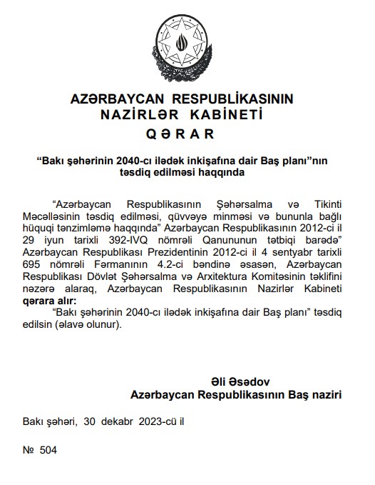 Qərara əsasən, Bakı şəhərinin 2040-cı ilədək inkişafına dair Baş planı təsdiq edilib.