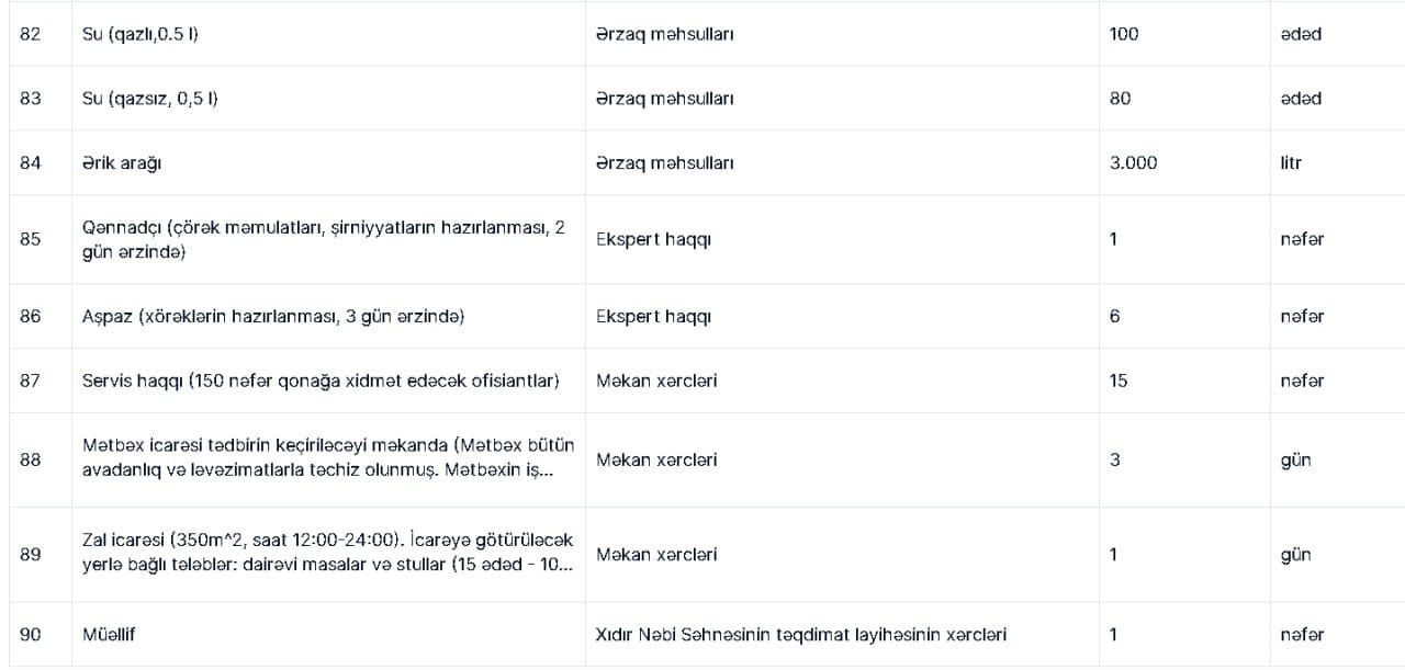 Həmçinin Agentlikdən bildirilib ki, ümumilikdə cədvəldəki məhsulların miqdarının göstərilməsində texniki olaraq səhvlərə yol verilib: “Cədvəldə 3.000 yazılıb, yəni 3 litr. Məsələn, hər hansı məhsuldan 400 kq yazılıb, əslində isə 0.4 kq olmalıdır. 150 nəfərlik tədbir üçün başa düşülən miqdarlarda - "tonlarla" və ya "yüz kiloqramlarla" məhsulun satın alınması, əlbəttə ki, heç bir məntiqə sığmır və məsələdə texniki bir səhvin olması aydın görünür”.