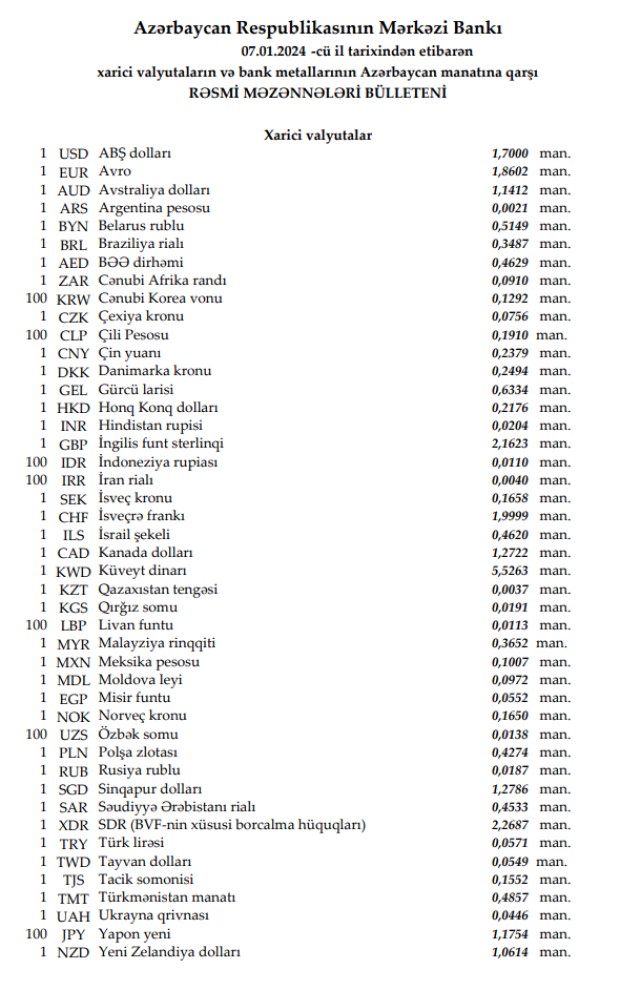Rəsmi məzənnələr açıqlandı