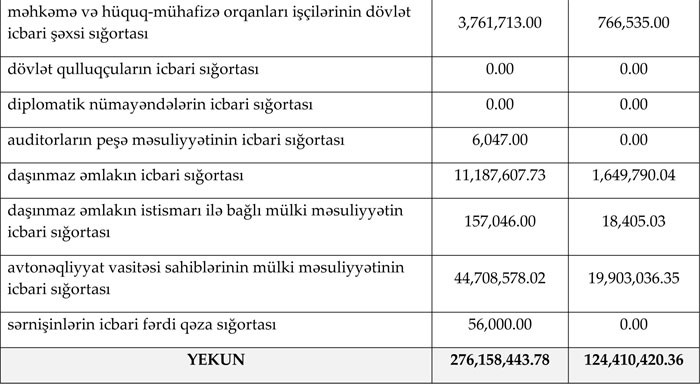 2017-ci ilin yanvar-iyun ayı ərzində sığorta şirkətləri tərəfindən 276 milyon 158 min manatdan çox sığorta haqqı toplanmışdır. Həmin dövr ərzində sığorta şirkətləri tərəfindən həyata keçirilən ödənişlərin həcmi isə 124 milyon 410 min manat təşkil edib. Bu barədə "Marja"ya Maliyyə Bazarlarına Nəzarət Palatasından bildirilib.