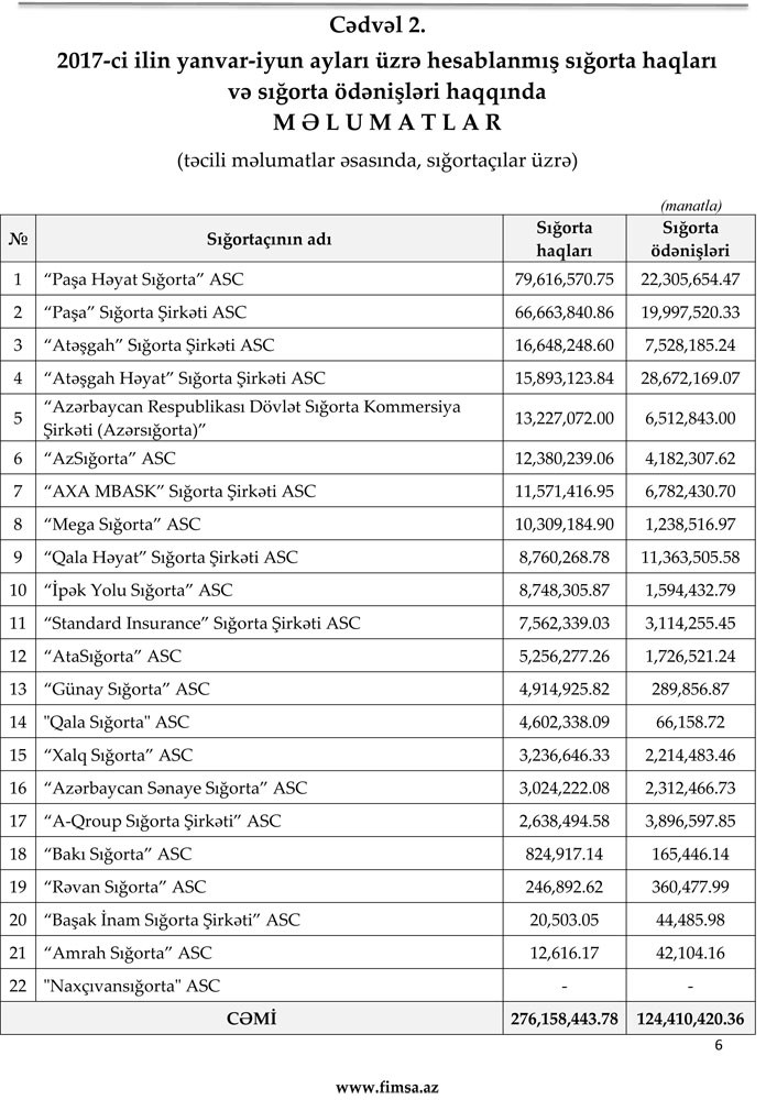 Qeyd edək ki, 2017-ci ilin yanvar-iyun ayı ərzində sığorta şirkətləri tərəfindən 276 milyon 158 min manatdan çox sığorta haqqı toplanmışdır.