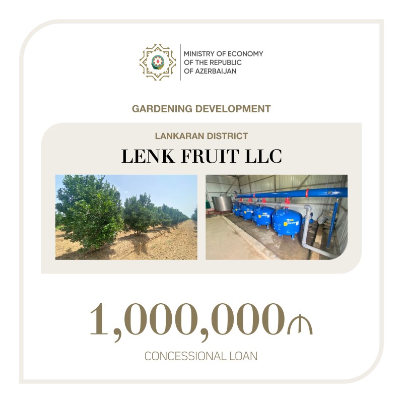 "LENK FRUİT MMC-nin intensiv sitrus meyvələrinin yetişdirilməsi üçün bağçılığın inkişafı layihəsinə 1 milyon milyon güzəştli kredit verib. Lənkəranda icra olunacaq layihə nəticəsində 30 yeni iş yerinin yaradılması nəzərdə tutulur",- nazir bildirib.