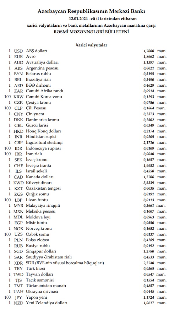 Rəsmi məzənnələr açıqlandı