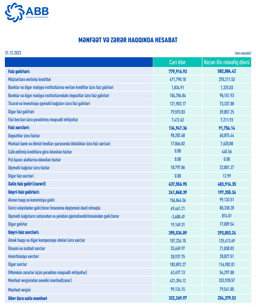 Ötən il "ABB" ASC 483 milyon 891 min manat əməliyyat mənfəətindən 62 milyon 497 min manat mümkün zərərlər üçün yaradılan məqsədli ehtiyatlara ayırıb və 99 milyon 124 min manat mənfəət vergisi hesablayıb.