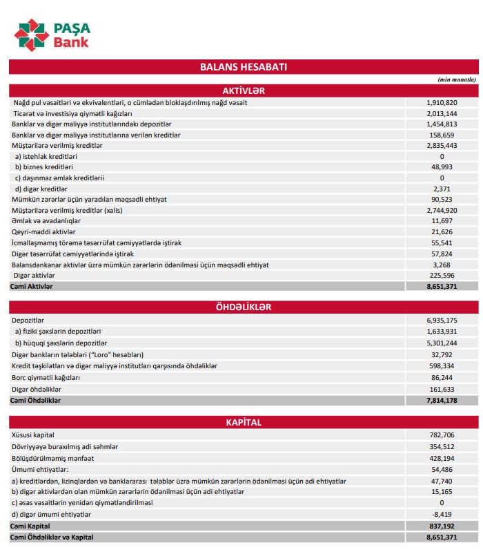 Ötən il "PAŞA Bank" qiymətli kağızlara investisiyalarını 267 milyon 601 min manat artıraraq 2 milyard 13 milyon 144 min manata, digər banklar və maliyyə institutlarındakı depozitlərini isə 861 milyon 208 min manat və ya 2,5 dəfə artıraraq 1 milyard 454 milyon 813 min manata çatdırıb.