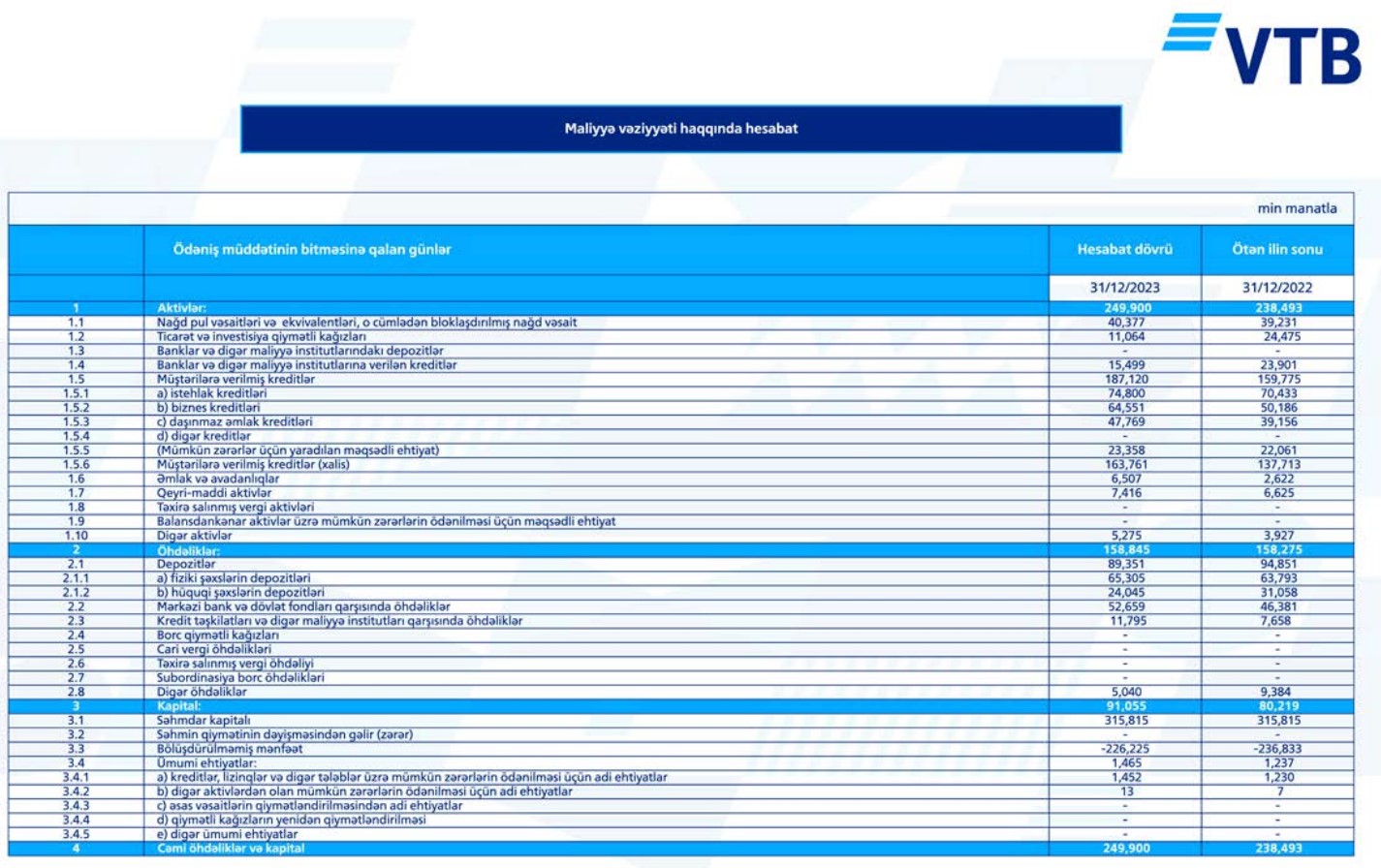 "Bank VTB (Azərbaycan)" ASC 2023-cü il üzrə maliyyə nəticələrini açıqlayıb.
