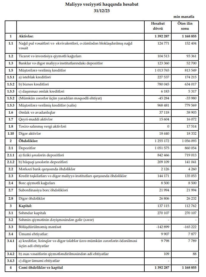 -Kredit portfeli 24.6% artıb və portfel 1 milyard manatı üstələyib. Hesabat dövrünün sonuna cəmi kredit portfeli 1 013.8 milyon manat təşkil edib.