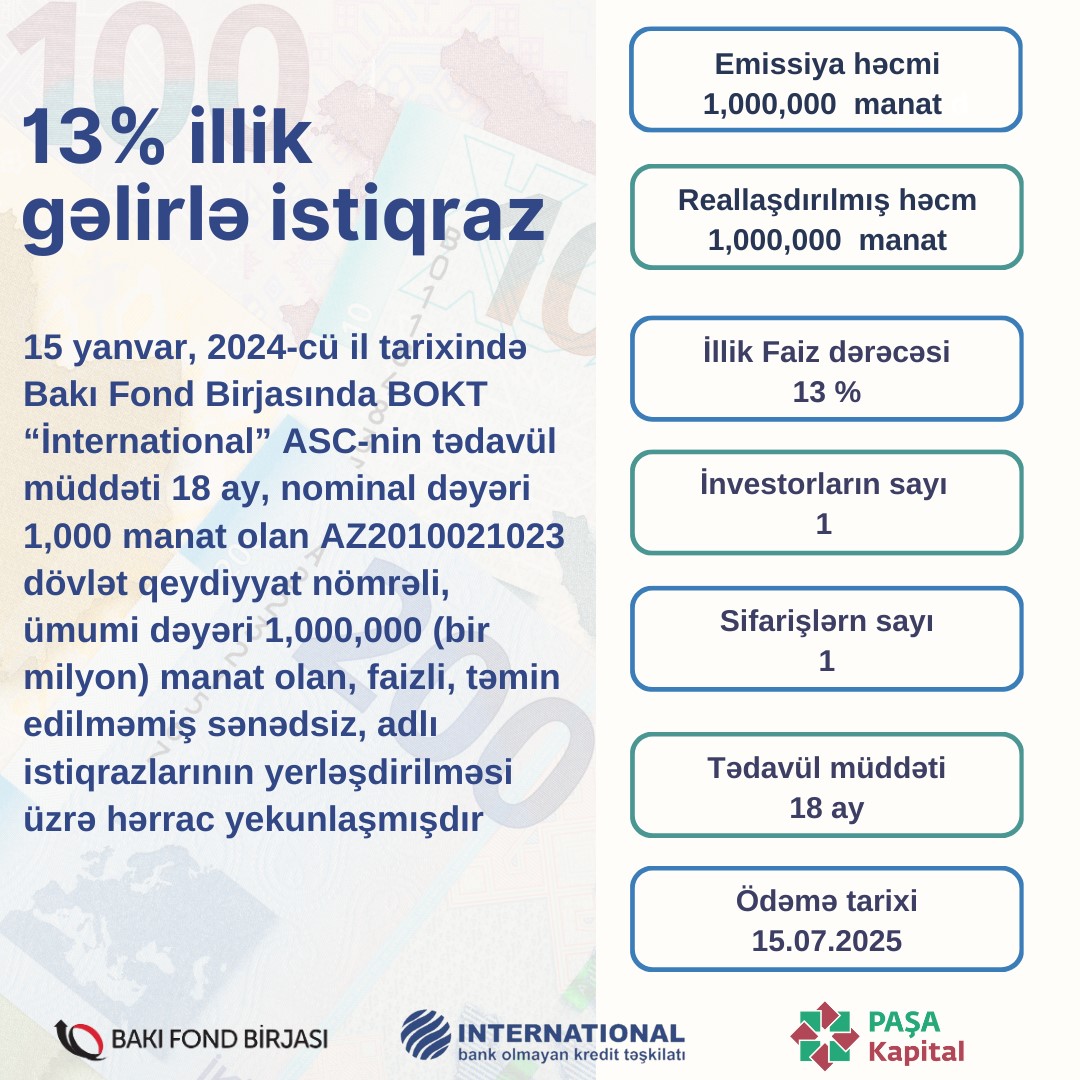 15 yanvar, 2024-cü il tarixində Bakı Fond Birjasında BOKT “İnternational” ASC-nin tədavül müddəti 18 ay, nominal dəyəri 1,000 manat olan AZ2010021023 dövlət qeydiyyat nömrəli, ümumi dəyəri 1milyon manat olan, faizli, təmin edilməmiş sənədsiz, adlı istiqrazlarının yerləşdirilməsi üzrə hərrac yekunlaşıb.