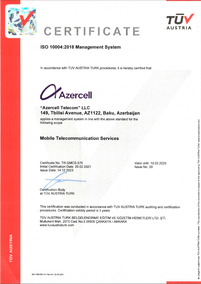 Mobil operator ISO 10004:2018 standartına uyğunluğunu bir daha təsdiq etdi(®) "Azercell Telecom" MMC Müştəri Xidmətləri sahəsində beynəlxalq standarta uyğunluq üzrə sertifikasiya auditini uğurla başa vurub.