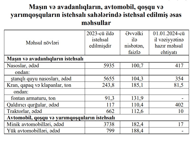 2023-cü ilin yanvar-noyabr aylarında Azərbaycanda 3079 ədəd minik avtomobili istehsal edilmişdi. Dekabrda yığılan avtomobillərin sayı 659 ədəd təşkil edib.