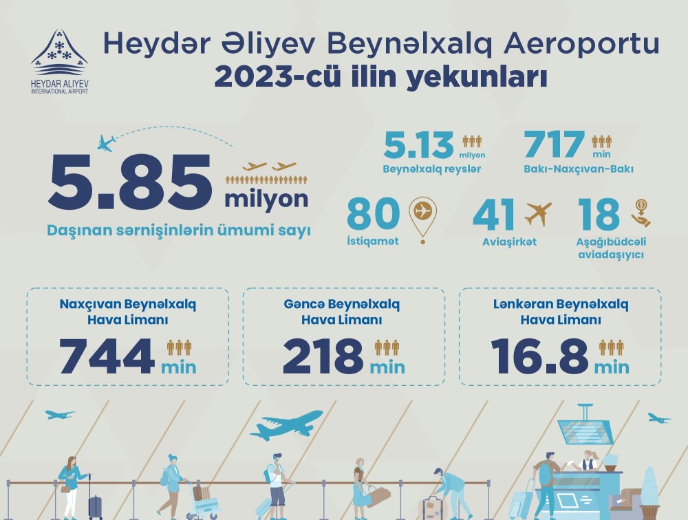 Qeyd edək ki, hasabat ilində ölkənin regional hava limanlarında da sərnişindaşımada müsbət dinamika müşahidə olunub, Naxçıvan Beynəlxalq Aeroportunda 744 min, Gəncədə 218 min, Lənkəranda isə 16 mindən çox sərnişinə xidmət göstərilib.
