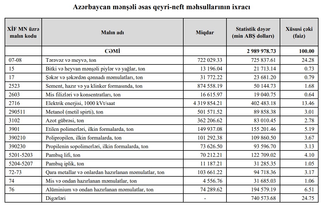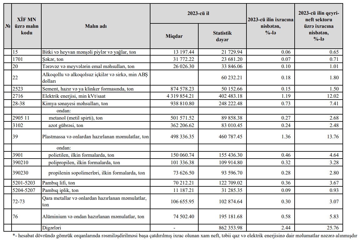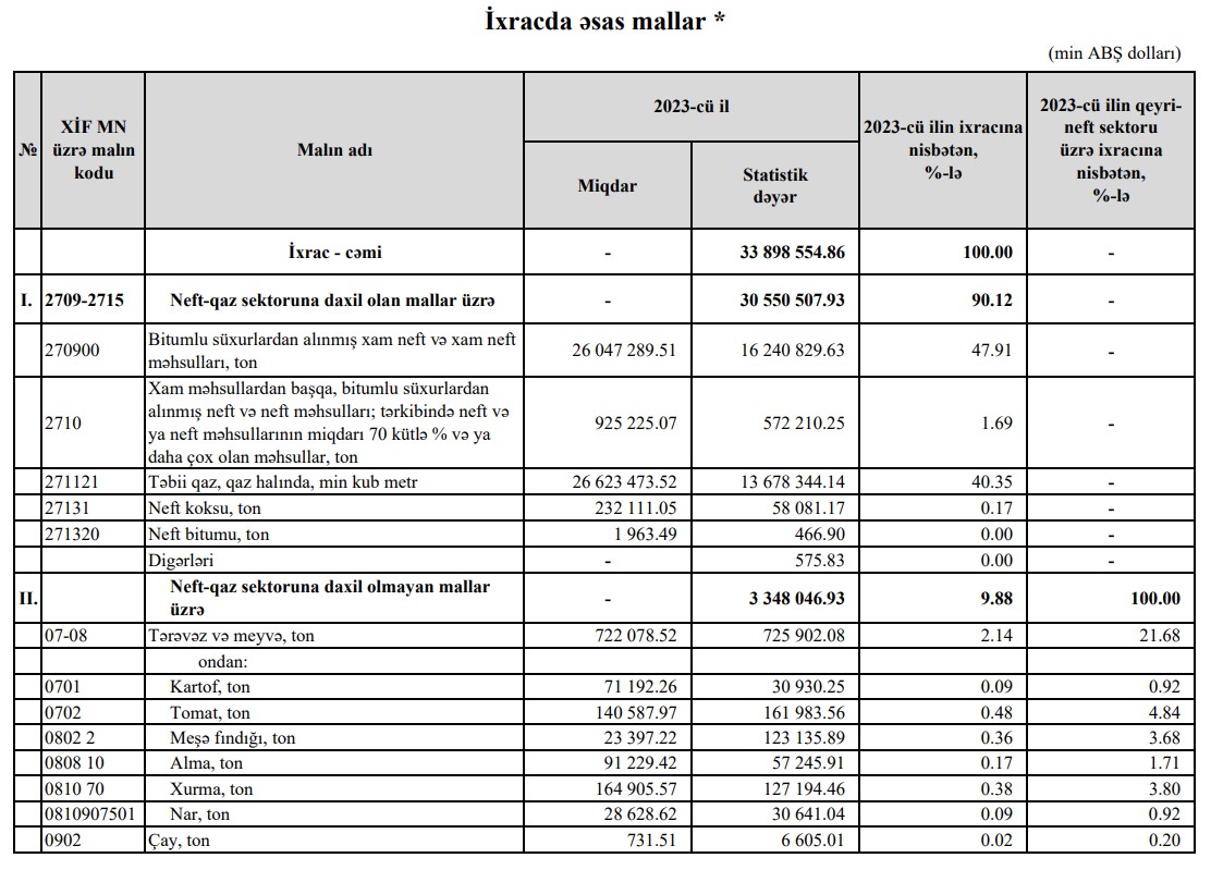 2023-cü ildə Azərbaycandan 30 milyard 550 milyon 508 min dollar dəyərində neft-qaz sektoruna daxil olan mallar ixrac edilib. Bu mallarıın ixracı Azərbaycanın ötən ilki cəmi 33 milyard 898 milyon 555 min dollarlıq ixracının 90,12 faizini təşkil edib.