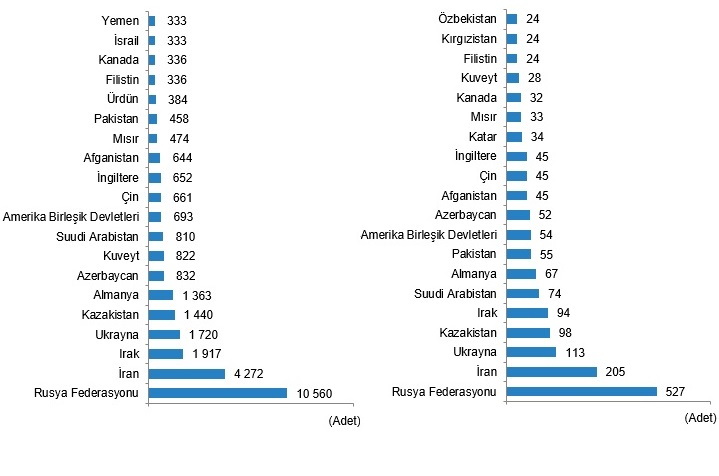 Türkiyədə ən çox Rusiya Federasiyası vətəndaşları ev alıblar edilib. Ötən il Rusiya Federasiyası vətəndaşları Türkiyədə 10 min 560 ev alıblar. Rusiya vətəndaşlarının ardınca 4 272 ev alışı ilə İran, 1917 ev alışı ilə İraq, 1720 ev alışı ilə Ukrayna, 1440 ev alışı ilə Qazaxıstan və 1363 ev alışı ilə Almaniya vətəndaşları gəlib.