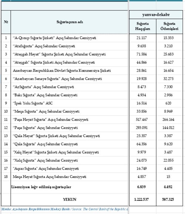 Qeyd edək ki, 2023-cü ildə Azərbaycandakı sığorta şirkətləri tərəfindən 1 milyard 222 milyon 537 min manat sığrota haqları hesablanıb və 587 milyon 325 min manat sığorta ödənişi həyata keçirilib.
