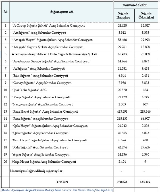 2023-də sığorta şirkətlərinin yığımları və ödənişləri - SİYAHI