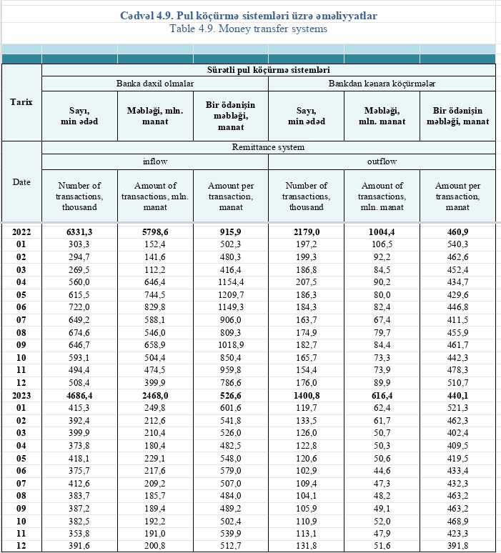 Beləliklə, ötən il pul köçürmə sistemləri üzrə banklara daxil olan vəsait 3 milyard 330,6 milyon manat, banklardan kənara köçürülən vəsait isə 388 milyon manat azalıb.