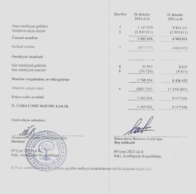 "Memorial Klinik" MMC 2022-ci ili 1 milyon 366 min manat xalis mənfəət ilə başa vurub. Şirkət koronavirusun tüğyan etdiyi və peyvəndləmənin başladığı 2021-ci ili 5 milyon 118 min manat xalis mənfəət ilə bağlamışdı. Beləliklə,"Memorial Klinik" şirkətinin xalis mənfəəti 2021-ci illə müqayisədə 2022-ci ildə 3 milyon 752 min manat və ya 3,7 dəfə azalıb. Şirkət pandemiyanın başladığı 2020-ci ildə 964 min manat xalis mənfəət əldə etmişdi.