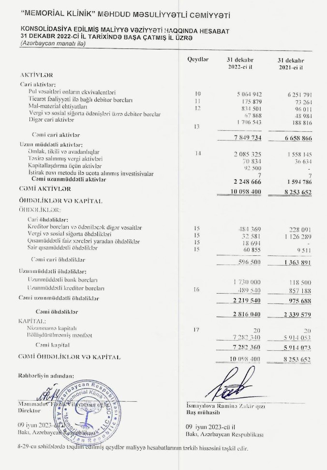 31 dekabr 2022-ci il tarixində "Memorial Klinik" MMC 10 milyon 98 min manat cəmi aktivlərə malik olub. Şirkət 2021-ci ilin sonunda 8 milyon 254 min manat cəmi aktivlərə malik idi.