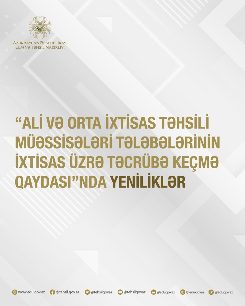 Nazirlər Kabinetinin müvafiq qərarına əsasən, ali və orta ixtisas təhsili müəssisələri tələbələrinin ixtisas üzrə təcrübə keçmə qaydalarında yeniliklər edilib.