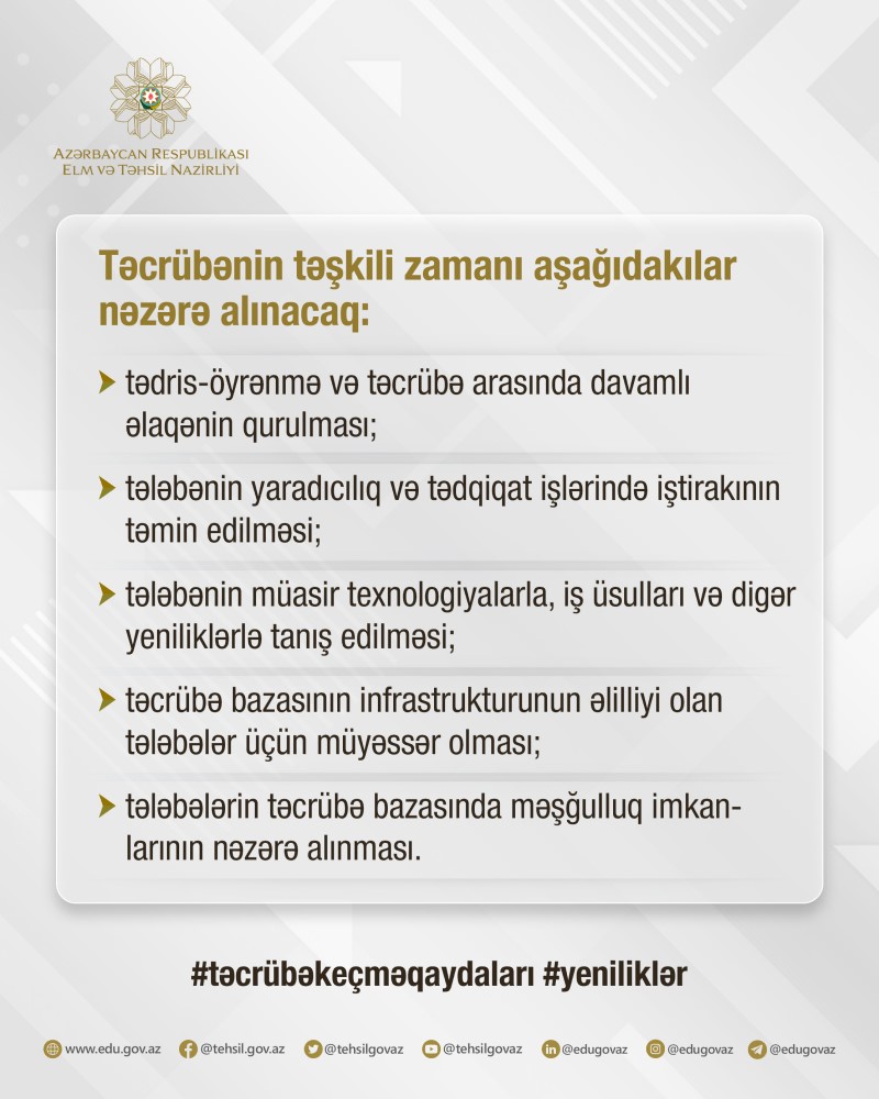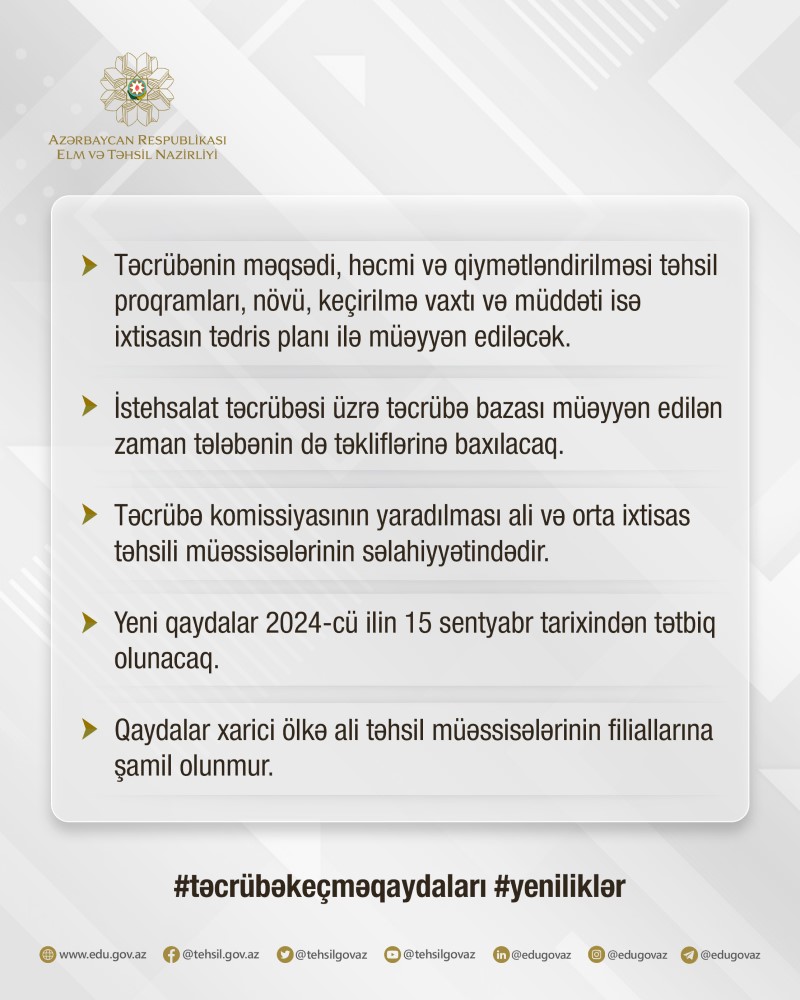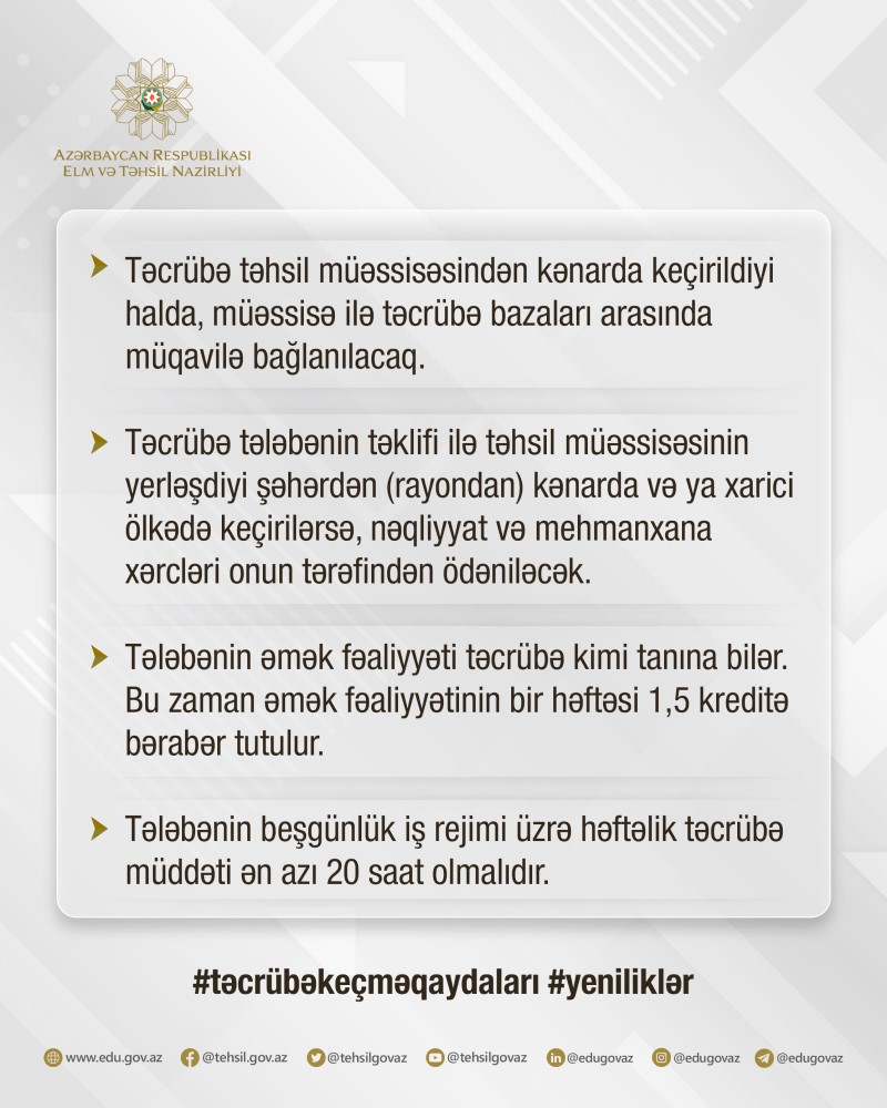 Elm və Təhsil Nazirliyindən Marja-ya verilən xəbərə görə, Yeni qaydalar 2024-cü ilin 15 sentyabr tarixindən tətbiq olunacaq. Sözügedən qaydalar xarici ölkə ali təhsil müəssisələrinin filiallarına şamil olunmur.Qaydalara əsasən, təcrübənin təşkili zamanı tədris-öyrənmə və təcrübə arasında davamlı əlaqənin qurulması, tələbənin yaradıcılıq və tədqiqat işlərində iştirakının təmin edilməsi, tələbənin müasir texnologiyalarla, iş üsulları və digər yeniliklərlə tanış edilməsi, təcrübə bazasının infrastrukturunun əlilliyi olan tələbələr üçün müyəssər olması, tələbələrin təcrübə bazasında məşğulluq imkanlarının nəzərə alınması əsas öhdəliklər kimi müəyyən olunub.