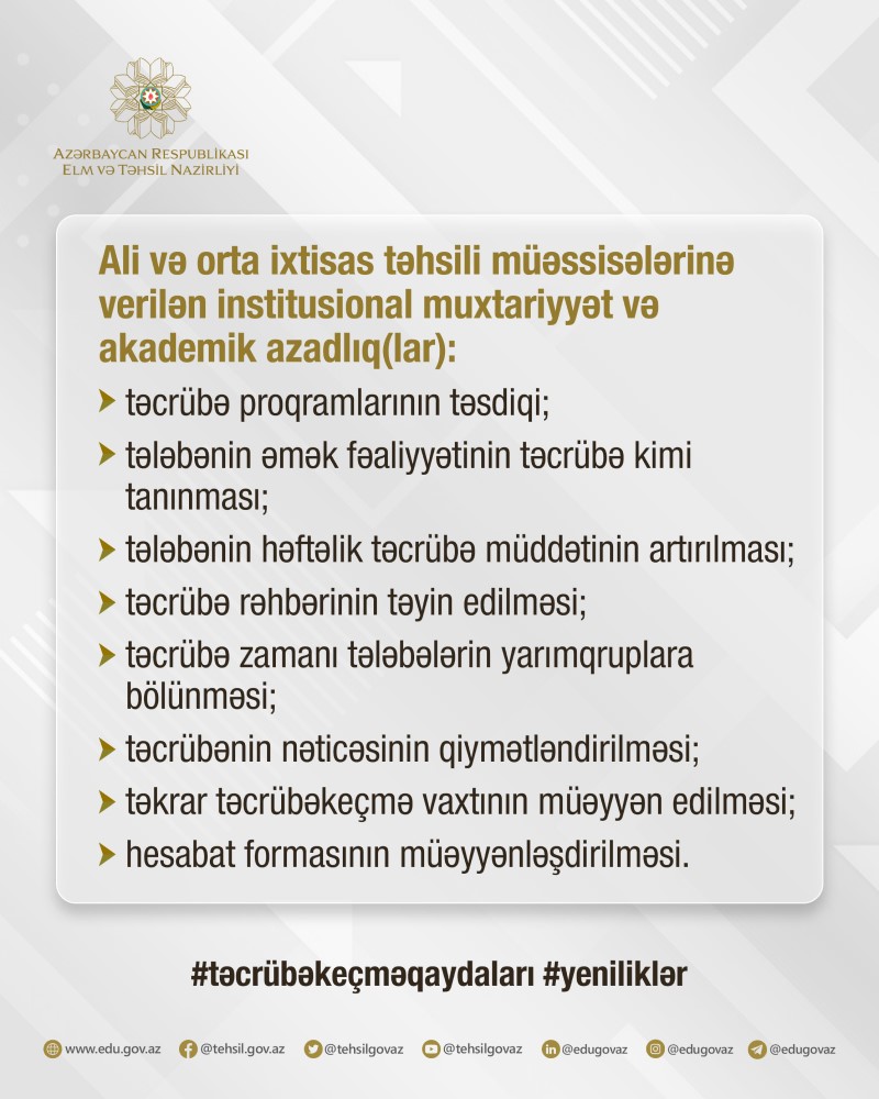 Yeni qaydalara əsasən, təcrübənin qiymətləndirmə üsul və meyarlarının hazırlanması və təcrübə komissiyasının yaradılması ali və orta ixtisas təhsili müəssisələrinin səlahiyyətinə verilib.