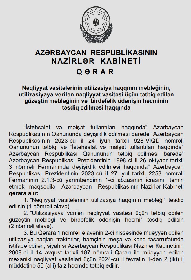 Utilizasiya haqları traktorlar, həmçinin meşə və kənd təsərrüfatında istifadə edilən, siyahısı Azərbaycan Respublikası Nazirlər Kabinetinin 2008-ci il 14 avqust tarixli 187 nömrəli Qərarı ilə müəyyən edilən mexaniki nəqliyyat vasitələri üçün 2024-cü il fevralın 1-dən 2 il müddətinə 50 (əlli) faiz həcmdə tətbiq edilir.