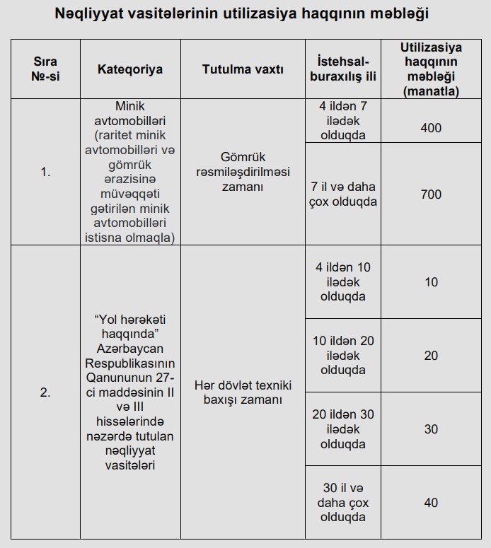 Gömrük rəsmiləşdirilməsi zamanı 400 - 700 manat, texniki baxışı zamanı 10 - 40 manat haqq alınacaq.Nəqliyyat vasitələrinin utilizasiya haqqının məbləği, utilizasiyaya verilən nəqliyyat vasitəsi üçün tətbiq edilən güzəştin məbləği və birdəfəlik ödənişin həcmi təsdiqlənib.