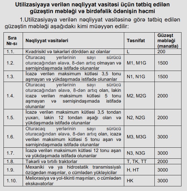 Qanuna görə, Azərbaycan Respublikasının gömrük ərazisinə gətirilən və istehsal-buraxılış vaxtından 4 il keçən minik avtomobillərinin gömrük rəsmiləşdirilməsi, həmçinin nəqliyyat vasitələrinin dövlət texniki baxışından keçirilməsi zamanı nəqliyyat vasitələrinin utilizasiyası fonduna utilizasiya haqqı ödəniləcək. Avtomobil istismara yararsız vəziyyətə çatdıqda, o utilizasiyaya veriləcək və buna görə avtomobil sahibinə birdəfəlik ödəniş veriləcək və yeni yerli avtomobilin alınması üçün güzəşt müəyyən olunacaq. Əgər avtomobil sahibi yerli avtomobil almağı nəzərdə tutmursa, o müəyyən edilmiş güzəşt məbləğindən daha az həcmdə birdəfəlik ödəniş alacaqdır.