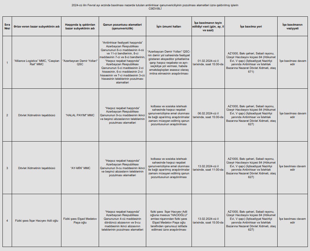 Marja.az xəbər verir ki, bu barədə 2024-cü ilin Fevral ayı ərzində baxılması nəzərdə tutulan antiinhisar qanunvericiliyinin pozulması əlamətləri üzrə qaldırılmış işlərin cədvəlində məlumat verilib.